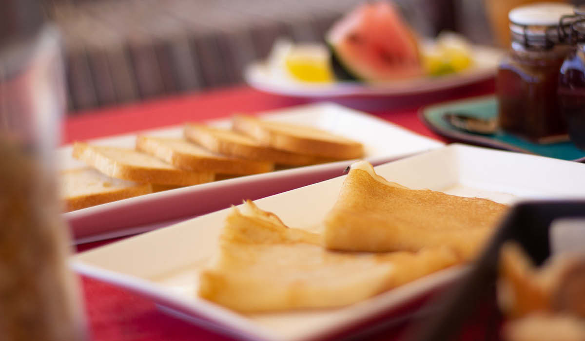 Boisson chaude, Jus de fruit, pain, beurre, confiture, miel, crêpes, œufs, céréales, fruits de saison